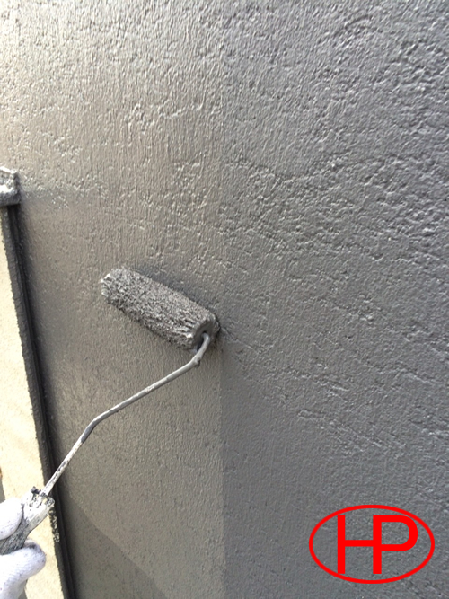 中塗り作業は基本上塗りと同じ材料で塗装します、固まると伸縮する塗料が主流で、ゴムのような柔らかさを持った塗膜になります。伸び縮みする為ヒビに追従します。中塗りは下地を紫外線や水や炭酸ガス等有害な環境からから守る役割を担います。中塗りは上塗りと違う色を塗った方がいい場合もあります、上塗り塗り残しミスがわかりやすく、お客様にもわかりやすい利点があります。しかし、上塗りのご希望の色合いによっては、中塗りが透けてしまうことがあるので、そういった場合は、同じ色を塗ることをおすすめ致します。