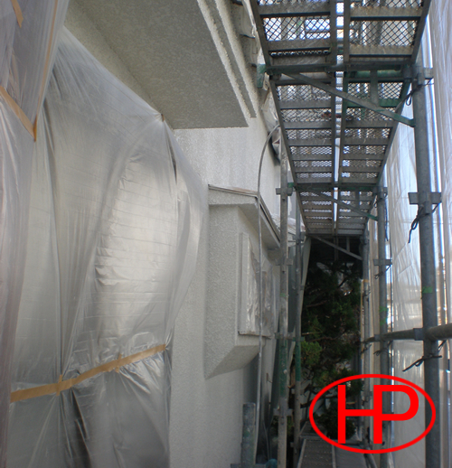 養生作業【外壁材以外の塗装しない開口部・床面・付帯部分・植栽等の養生を行います。】